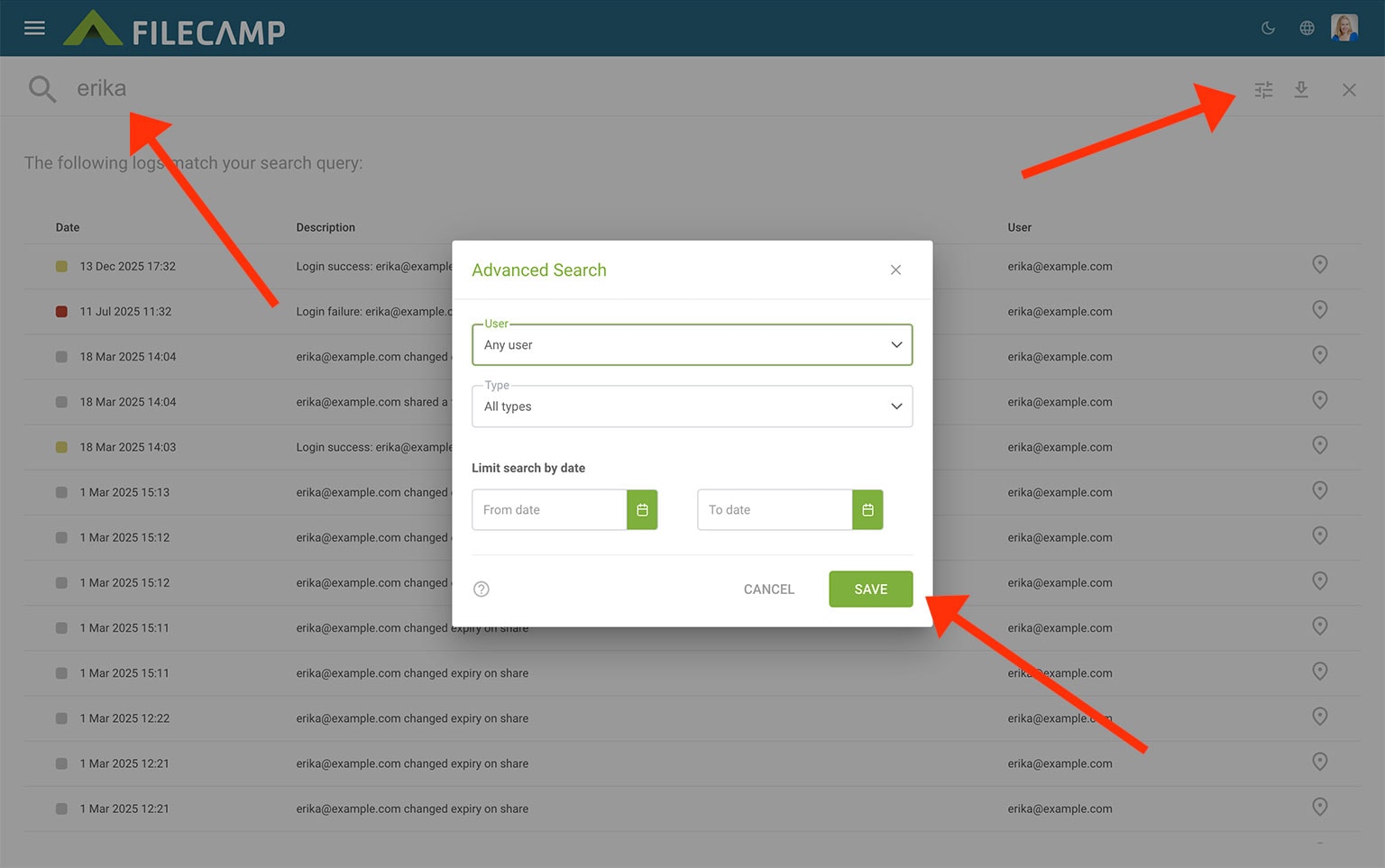 The log is a powerful tool that keeps track of everything that happens in your Filecamp account. You can view, filter, and export activity reports to help keep track of your Filecamp usage.